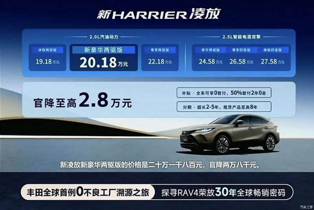9 月 12 日本,新款丰田凌放 HARRIER 新车正式上市,共推出新车 6 款车,售价 19.18-27.58 一万元,起步价下降 2 万元。与目前的车型相比,减少了三种设备(2.0L 两款,2.5L 混合动力一款)。新款车型作为年度改款车型,主要对设备进行调整。官方无上减幅 2.8 万元,全系可享受 0 首付,最长 5 年分期。
