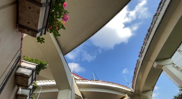 蓝天、白云、花瓣勾勒出一幅美丽的城市画轴,让许多在高架路上行驶的市民大饱眼福。