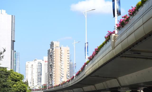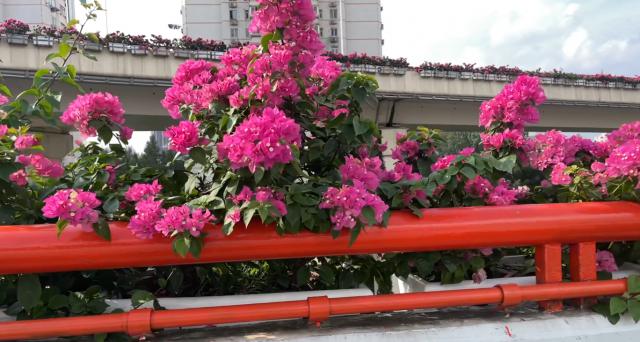 最近,申城高架上的新九重葛进入了最佳观赏期。他们摇曳着婀娜多姿的身姿,用向上的活力展现出“热情、坚韧、拼搏”的花语,将高架变成了一个明亮的“花廊”。
