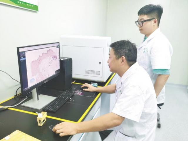 公安县人民医院病理科主任彭晓蓉对毛某进行了皮肤活检,并将其病理标本制作成数字切片。她通过了 AI 对细胞病变进行初筛治疗,然后不断放大数字切片,反复观察细胞病变,最终消除肿瘤和扁平苔藓的可能性。
