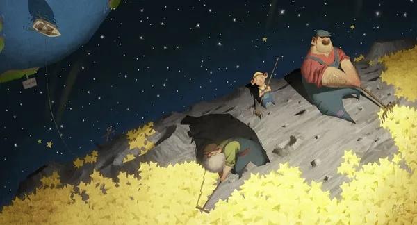 在爸爸拿出一个长梯子,示意男孩往上爬的时候,我才知道,他们的工作实际上是清理掉落在月亮上的星星。
