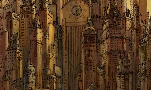 高楼高到天空看不见边,斜坡几乎都是高楼。 90 垂直度,人的脸越来越像马,这是一部典型的法国讽刺片。当你注意到这个小细节,孩子以后看更多相关作品的时候,也会主动带入这种思维。