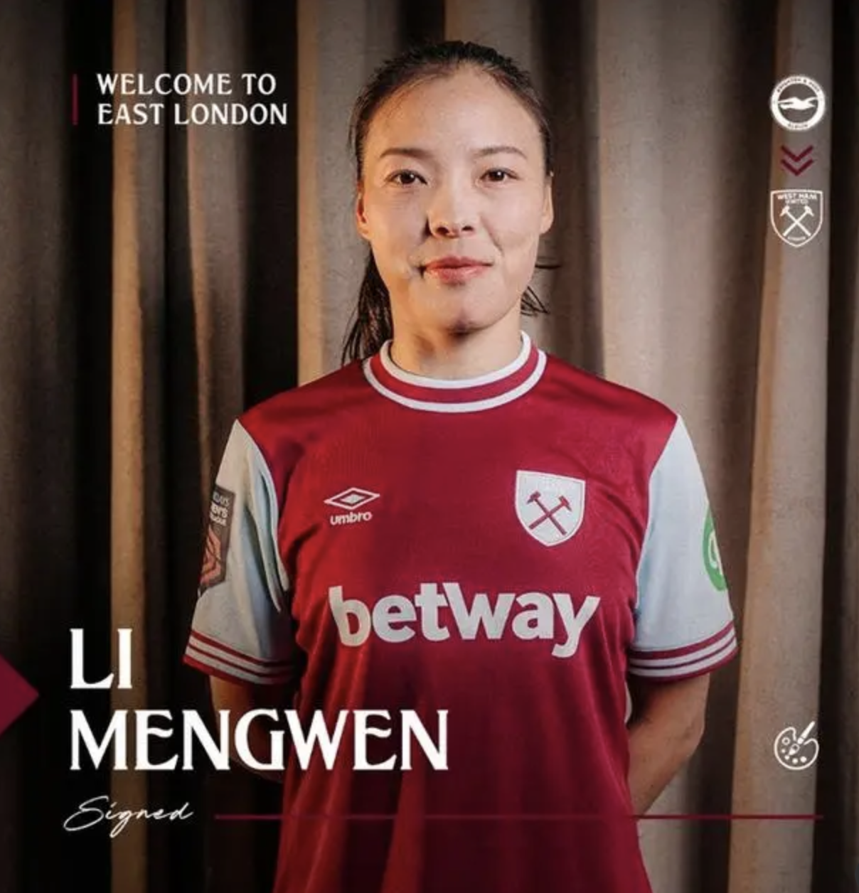 西汉姆联女子足球队正式宣布从布莱顿女子足球队租借李梦雯。
