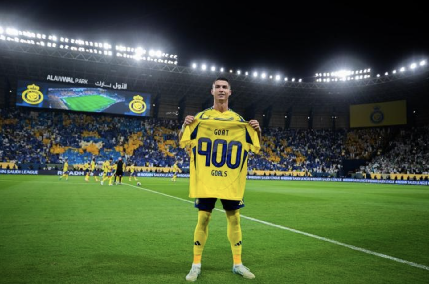 在职业生涯中,利雅胜利官方向C罗赠送了一件球衣,纪念他打进900球。