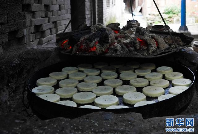 △贵州省榕江县寨蒿镇一家麻饼作坊,用碳火烤麻饼。新华网(韦贵金 摄)