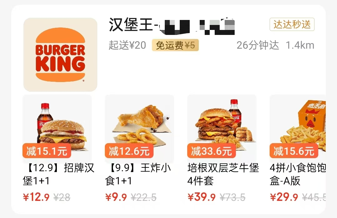 但是,虽然是咖啡奶茶区,但是我还是发现了汉堡王、永和王等几个餐饮品牌,由达达秒提供配送服务,免运费。