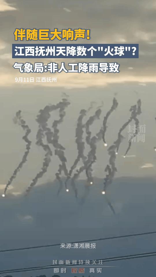 气象局回应网友拍摄天降火球:不是人工降雨,具体情况尚不清楚:9 月 11 日本,江西抚州,一位市民发视频称江西抚州天降多个“火球”,引起关注。抚州市气象局工作人员表示,此前已接到群众关于抚州上空火球的咨询,并表示, 9 月 11 日下午 5-6 点多,抚州市气象局并未进行人工增雨工作,这种情况并非人工增雨所致。因特网上的视频真伪各不相同,目前对火球状况了解不多。