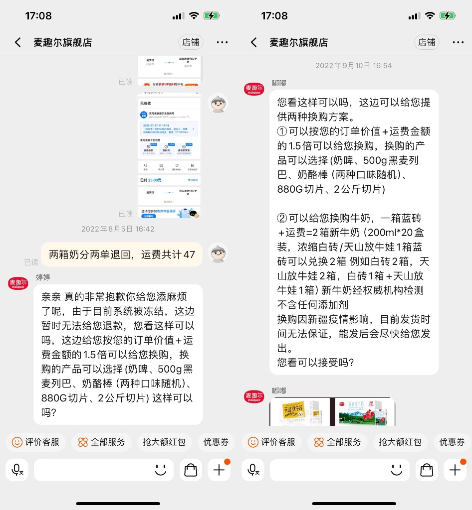 2022年7月25日,张先生联系麦趣尔旗舰店申请退货。客服表示将无条件申请退货,并要求退奶时,张先生提前支付了47元的运费。然而,在麦趣尔旗舰店签署退款牛奶后,他从未退款。张先生多次催促退款,对方以系统冻结为由拖延,并提出了购买计划,这一举动被张先生拒绝。