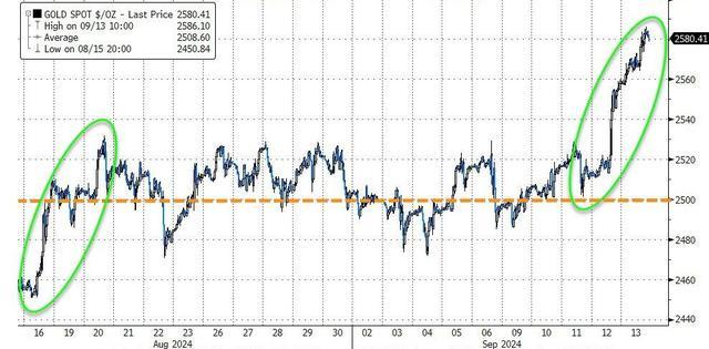 降息对黄金有利,第二天黄金价格继续创历史新高。当美股在午盘再次创下新纪录高位时,现货黄金上涨至2586美元以上,当天上涨超过1%,纽约期金上涨超过2610美元,当天上涨1.3%。
