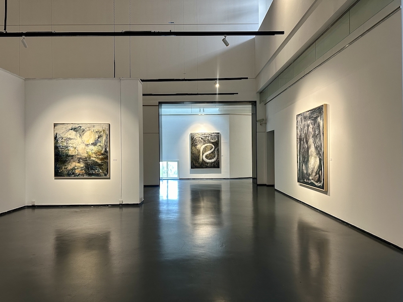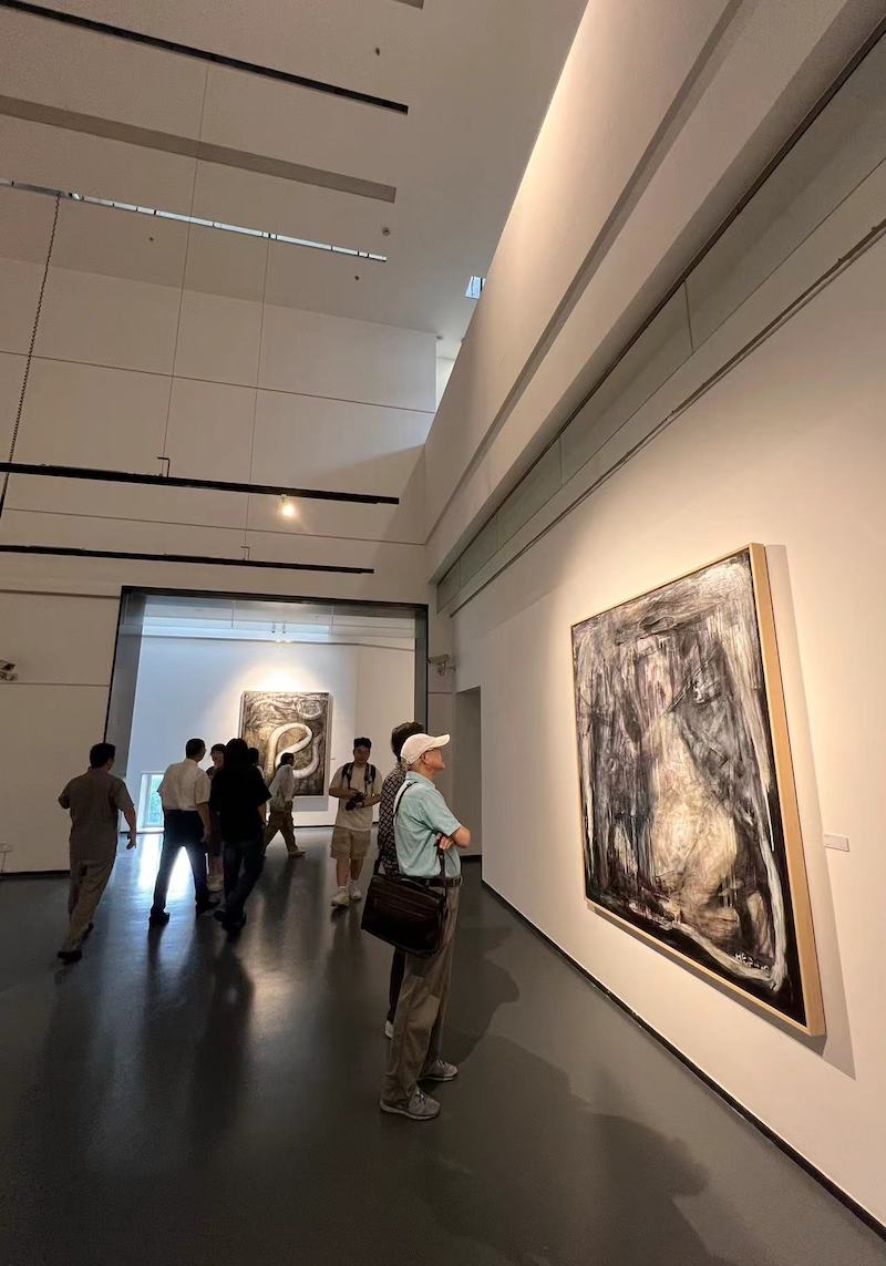 走进上海视觉艺术学院二楼回字形展厅,展示在我们面前的大型油画,有几十年前何平的作品,也有最近感慨万千的作品。我们可以发现,最近的作品色彩丰富,色彩和笔更大胆、更伸展、画笔流畅、氛围描绘,让这些抽象的作品更加放松和紧张。