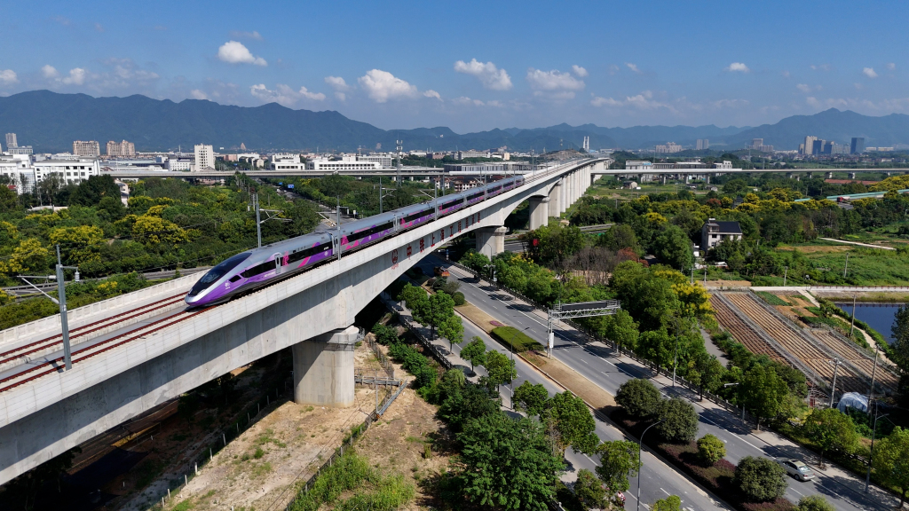 火车驶往杭温高铁跨杭黄铁路特大桥。 孟凡琼 图
