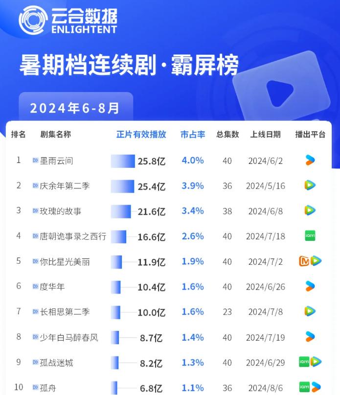 近日,云合数据发布了夏季剧集报告。数据显示,优酷自制剧《墨雨云间》在“连续剧霸屏榜20”上强势屠榜。、Top20集平均v30榜单、在新剧《热播期集均榜Top20》三榜中排名第一,与第二名相差甚远,成为名副其实的“剧后”。除了《墨雨云间》之外,《惜花芷》《花间令》等优酷独播剧也在榜单之上,实现了上半年7部独播剧的排名。 20。