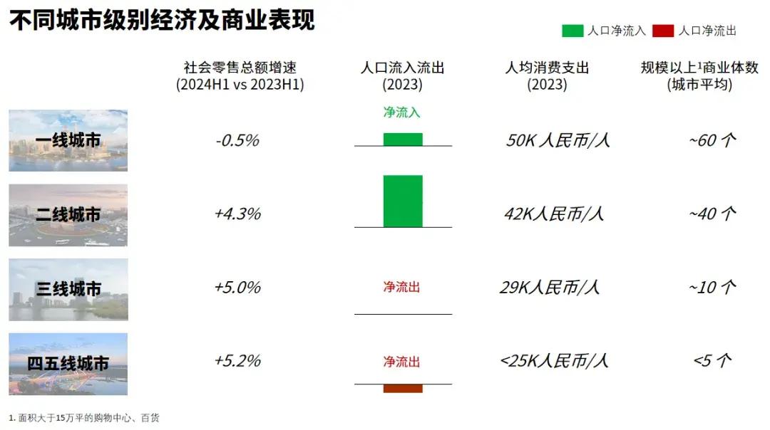 近年来,二三线城市正在迅速向一线城市靠拢,无论是消费能力还是总人口。统计数据显示,2024年1-6月,一线城市社会零售额同比下降0.5%,而二线城市、三线城市等城市增长4-5%。特别是二线城市增长强劲,成为人口流入最高的城市线,其人均消费支出和规模以上商业数量与一线城市非常接近。