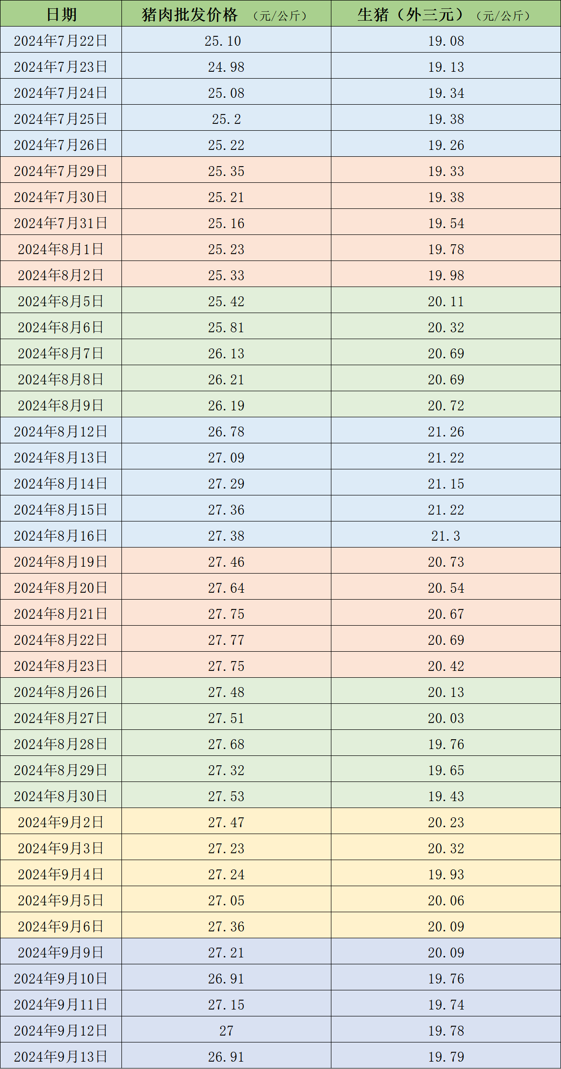 本周国内生猪价格下跌后波动调整,周均价格环比下跌。根据中国养猪网的数据,9月13日,生猪(外三元)价格为19.79元/元。KG,相对于上周五(9月6日)的20.09元/KG,下降了1.5%。本周生猪均价为19.83元/周。KG,比上周每公斤20.13元的平均价格下降了1.5%。