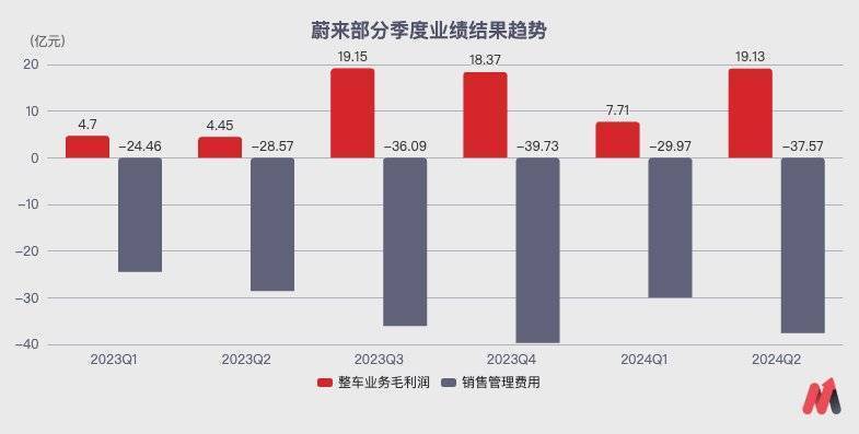 先说制造能力。2024年第二季度,蔚来在销量不到6万辆的情况下,将车辆毛利率提高到了12.2%的新势力头部水平。销售管理成本方面,今年第二季度销量增长100%以上,销售管理成本仅增长31.5%。