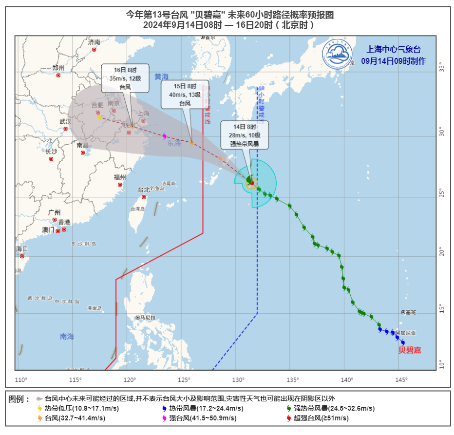 今天11点,上海气象局表示,今年13号台风“贝碧嘉”位于距浙江省舟山市东偏南约930公里的洋面上。最大风力10级(28米/秒)在中心附近,强度保持在强热带风暴级。预计“贝碧嘉”将以每小时30-35公里的速度向西向北移动,强度将逐步加强。14日晚上,它通过琉球群岛移动到东海东海。15日上午,它逐渐向西向北移动,靠近华东沿海,并逐渐向西向北移动。将于15日晚至16日上午登陆浙北至上海一带,登陆强度为台风级或强台风级,登陆后强度逐渐减弱。