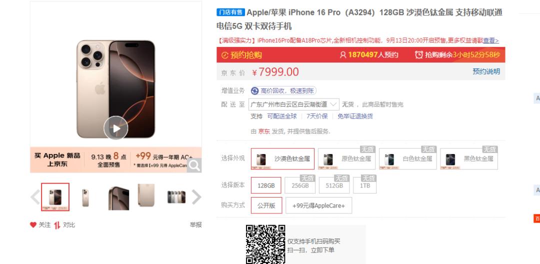 京东上iPhone16 公开版Pro系列在10分钟内被抢购一空,但是 AppleCare99元 这个系列还是有货的,iPhone16系列目前整个系列还可以购买。只是和往年秒空的情况相比,今年就不那么好卖了。