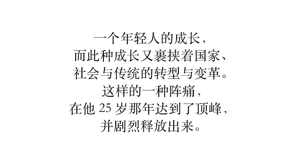 “一个年轻人的成长,这种成长包裹着中国、社会和传统的转型和变革。这样的痛苦在他25岁的时候达到了顶峰,并被强烈释放。”