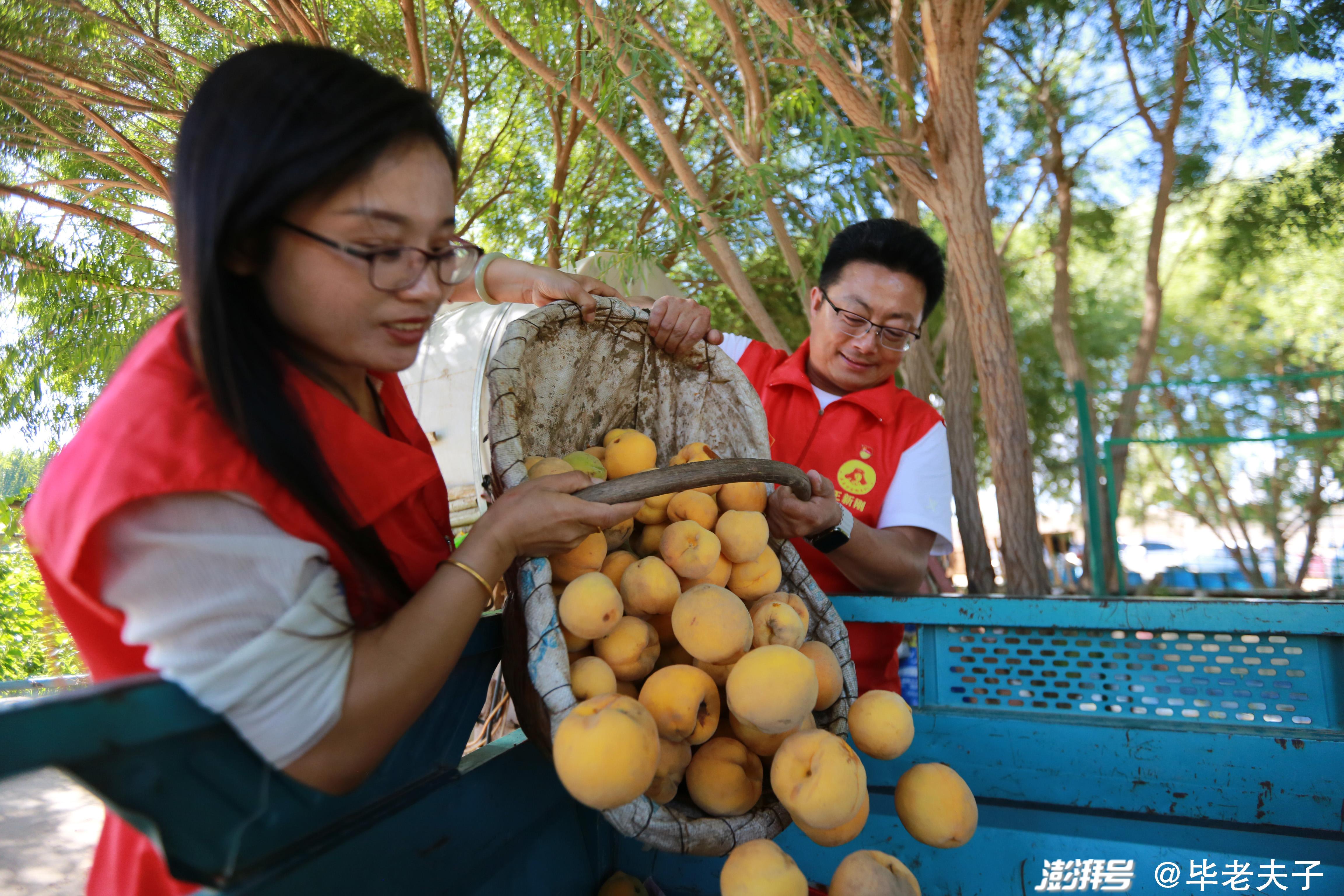 为了帮助他们解决这个迫切的问题,库车市雷锋队的志愿者迅速行动起来,开车去帮忙采摘。图为库车市党员志愿者、雷锋队队长王新刚(右)、队友闫敏将刚采摘的黄桃倒入农用三轮车厢。