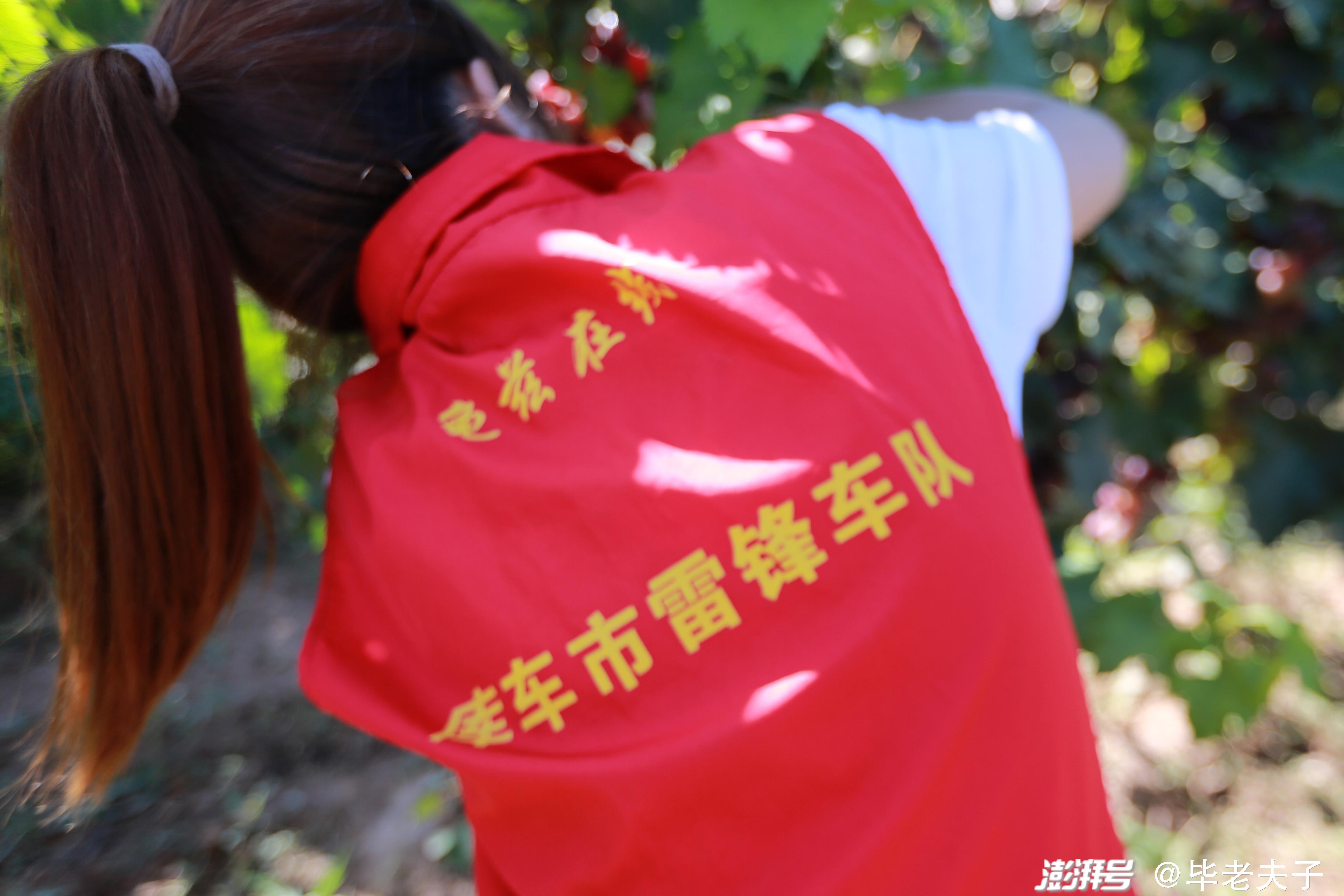 库车市雷锋车队队长王新刚说:“我们下到田间,帮助农民收集和销售,解决他们生产和生活中的实际问题,把志愿服务实际上放在村民的心里,用温度的志愿者活动来处理村民的迫切需求。”图为志愿者在田间劳动的身影,在蓝天白云的映衬下格外美丽。