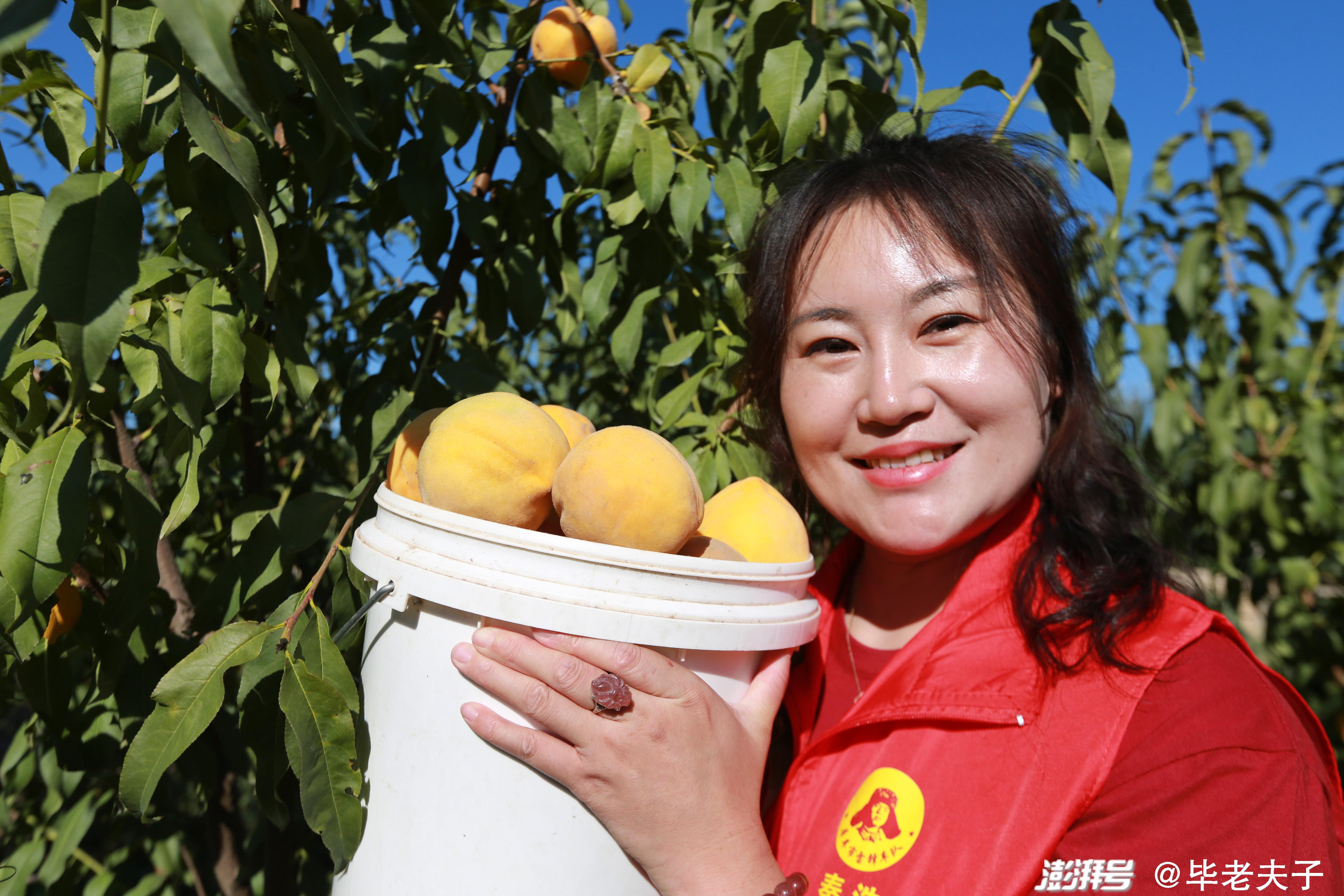 2024年9月3日,新疆阿克苏库车市比西巴格乡格代库勒村,爱心志愿者、雷锋队队友闫敏正在收获新疆黄桃,脸上挂着丰收的喜悦。(毕兴世解金钢 摄影报道)