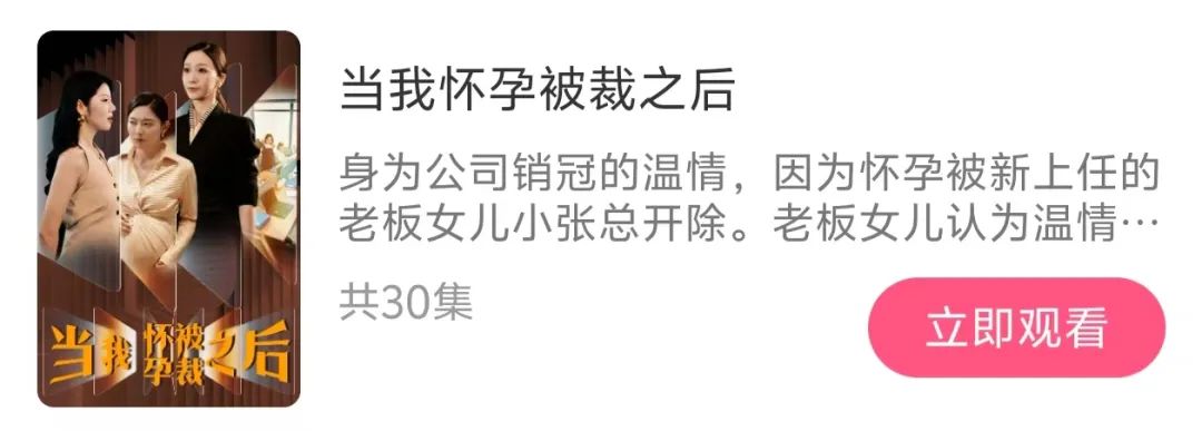 最近有一部很火的短剧叫u200c《我怀孕被裁后的u200c》,讲述了35岁以上的故事。 公司销售冠军温暖被裁员的故事。她为公司努力了很多年,但由于怀孕,u200c被新任命的老板女儿小张开除,没有赔偿,也没有生育津贴。