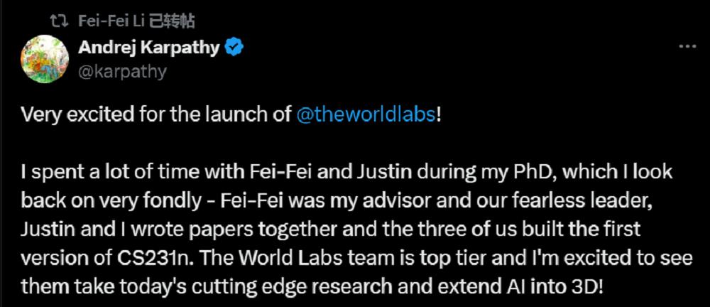 World在李飞飞等人正式宣布。 在Labs的相关信息之后,许多著名的AI研究人员也发来了贺电。前特斯拉AI高级总监Andrej,李飞飞的博士生,OpenAI创始成员 Karpathy在X平台上回忆,他曾经和李飞飞和World 另一位Labs创始人Justinn Johnson推出了斯坦福首个深度学习课程,他称之为World Labs的团队是“顶级”的。。