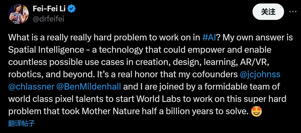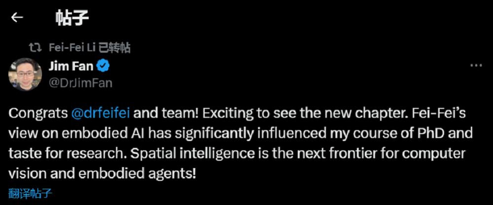 第一位OpenAI见习生,英伟达高级科学家兼顾身体智能实验室负责人Jim 在X平台上,Fan还分享了李飞飞的官方宣布Worldd 推文,Labs,并表示李飞飞对她的研究方向有很大影响。。