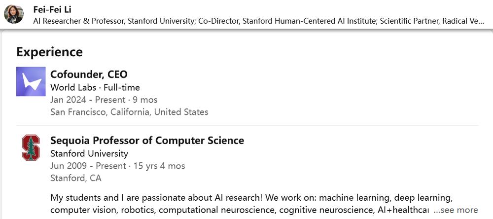 按照李飞飞的领英主页,World Labs成立于2024年1月,这比她第一次传出创业新闻的时间要好。再次上午4个月。