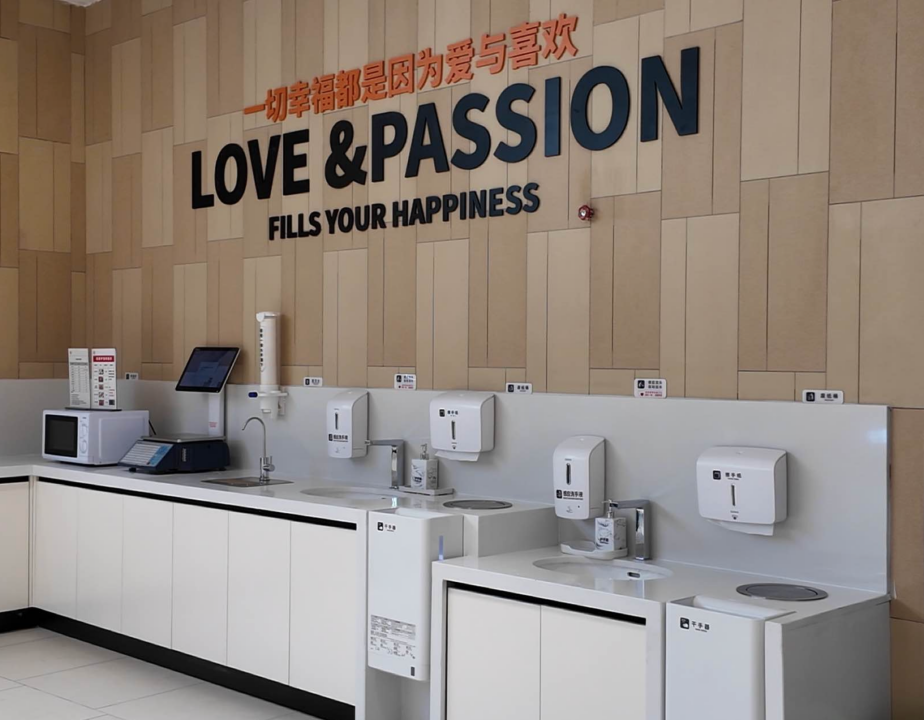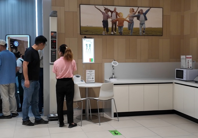 为了给顾客提供更方便舒适的购物环境,该店增加了客户休息区和多个便民服务区。在客户休息区,可以看到各种便民设施,如水槽、护手霜、饮用水、一次性纸杯、共享充电宝、公平秤、微波炉、身高体重测量仪、视力检测等。