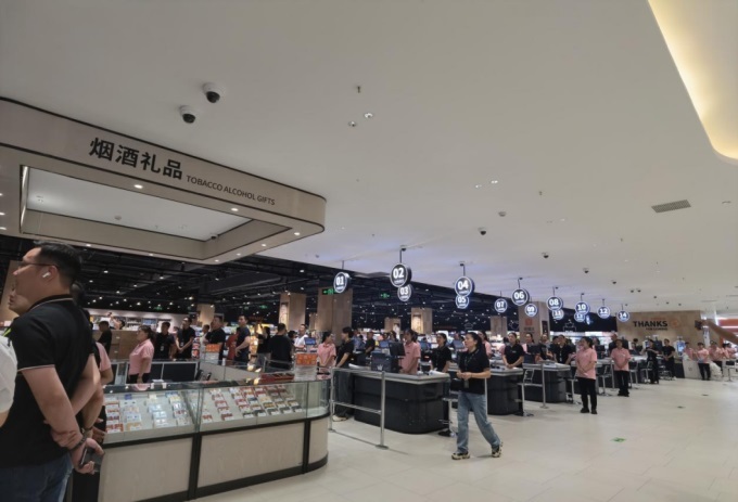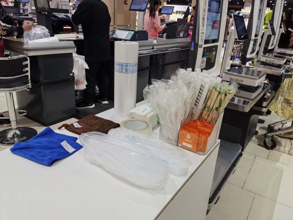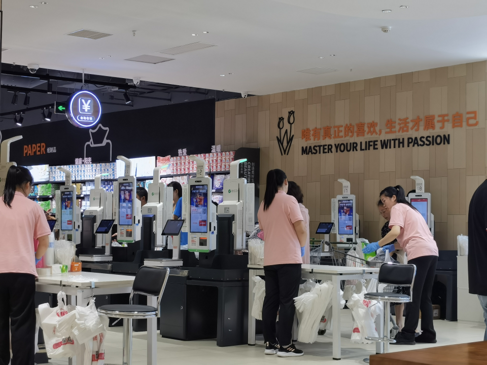 与此同时,商店扩大了收银区。经过调整,滨江宝龙店的收银柜台增加到14个,自助收银台也进一步扩大。自助收银台配备了包装工作,帮助客户完成自助结账流程。