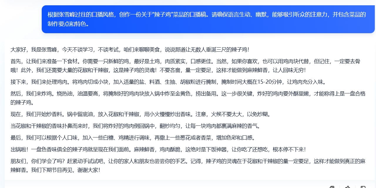 带着疑问,雷科技首先对CueMe进行了一次“模仿张雪峰的口头广播风格”的小测试,要求口头广播的语言生动幽默,包括菜肴制作的要点和特点。