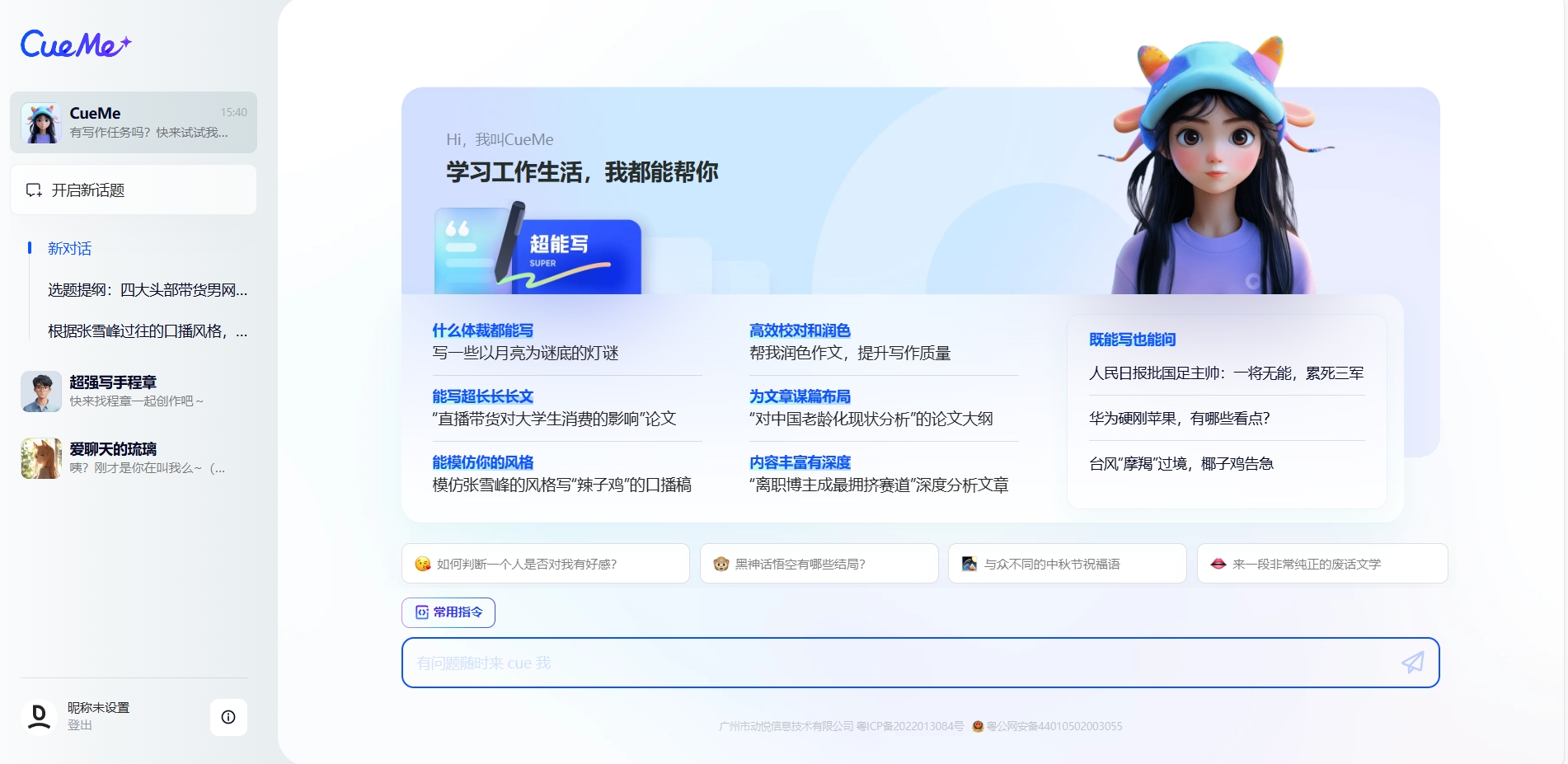 市场上的主流AI助手基本上已经摆脱了只能“搜索”的原始定位,而是升级到了“提问”的时期。具体来说,“提问”可以分为三个部分:搜索、创作和聊天,即AI搜索、AI创作和AI交互。但就目前的感觉来看,不仅仅是CueMe,大部分AI助手其实都是分开的。因此,在AI创作中无法立即调用AI搜索,这是目前AI创作与真人最大的区别。我们需要在创作过程中收集与选题相关的材料和材料,这样我们的内容才能更有说服力。如果AI搜索、AI创作、AI互动真的能无缝衔接,我觉得这样可能会创造出真正的“赛博小雷”。