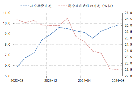 鉴于需求不足和预期疲软,宏观层不断增加逆周期调控,尤其是政府融资需求不断增加。截至8月底,政府融资率已突破10万亿/年,达到10.3万亿/年。去年同期为6.7万亿/年,增加3.6万亿;去除政府后,社会融资率下降到不到22万亿/年,去年同期为26.2万亿/年,下降4.2万亿。单纯从规模变化来看,两者的变化幅度相差6000亿。