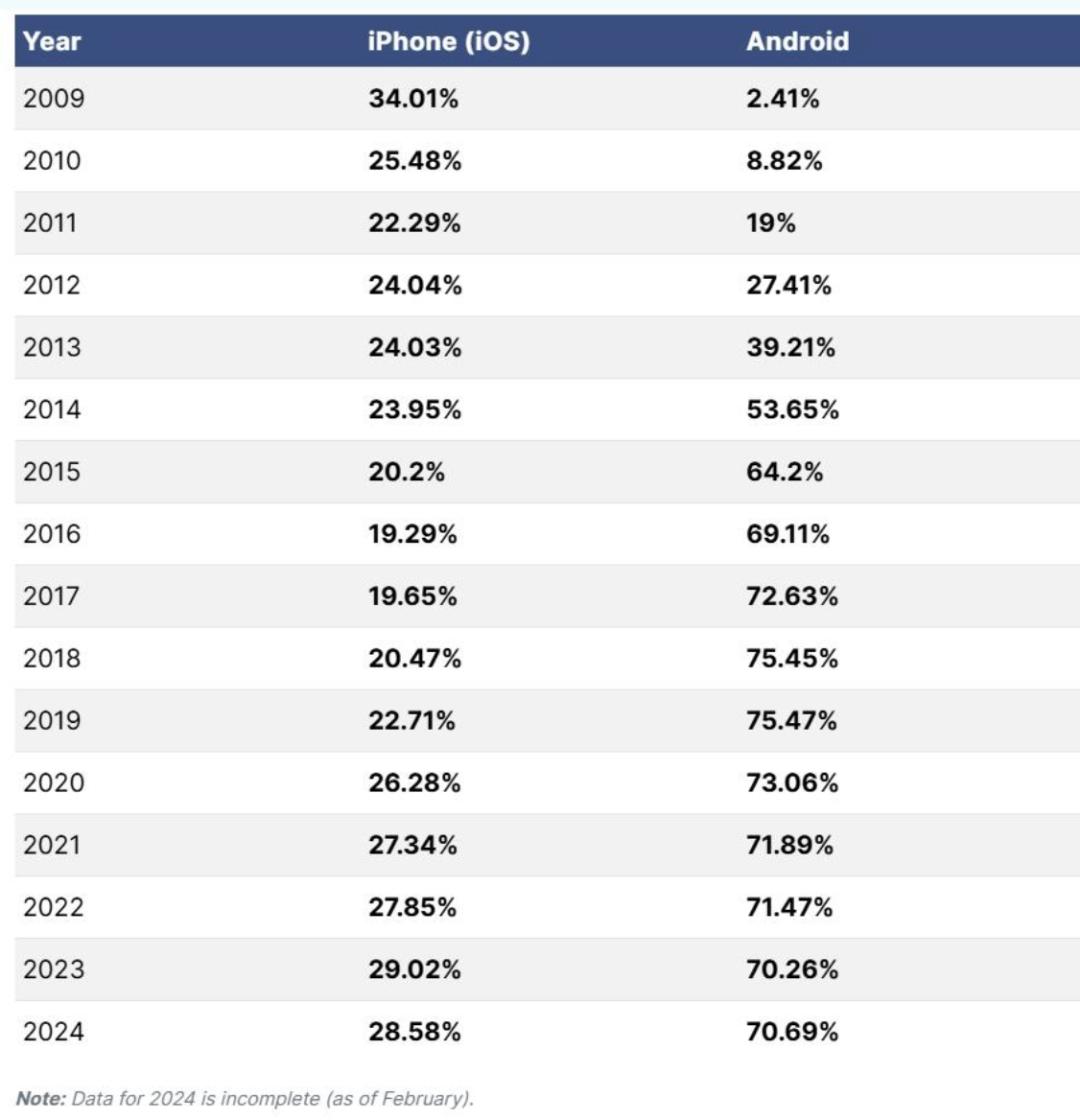 如今,Android 早就帮 Google 实现最初的愿景-转变为移动 OS 霸主。根据 2024 年数据,Android 占据全球操作系统 70.69% 市场份额。