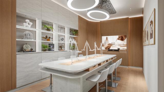 除了常规的产品展示,一楼还提供了个性化定制的专属区域。在这里,我们可以看到积家所有手表的所有表带。客户也可以尝试搭配不同的表带材料、颜色或缝线,包括在内。 Reverso 不同工艺的定制也可以在旋转系列上完成。二楼,积家带来了安东尼制表大师工作坊的展览区。(Atelier d'Antoine),使顾客能更沉浸地感受积家的工艺之美。