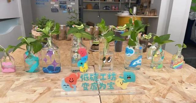 展位一角,黄家路街区环保友好品牌青创公益联合生产的“咖啡渣循环计划”产品映入眼帘。居民们用咖啡渣作为肥料来保湿植物,并在手绘玻璃瓶中种植花卉,表现出特殊的含义。值得一提的是,车间里的室内座椅也经过了特殊的设计,比如废弃水果篮和木板制成的回收座椅,废弃汽油桶改造的简单酒吧,废弃木板制成的储物架...这些都表现出创新精神和环保意识。