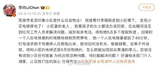 9 月 13 那天晚上,演员李纯怒斥物业。他说,由于芜湖市名人对小区电梯停电的印象,母亲独自被困电梯 40 分钟。