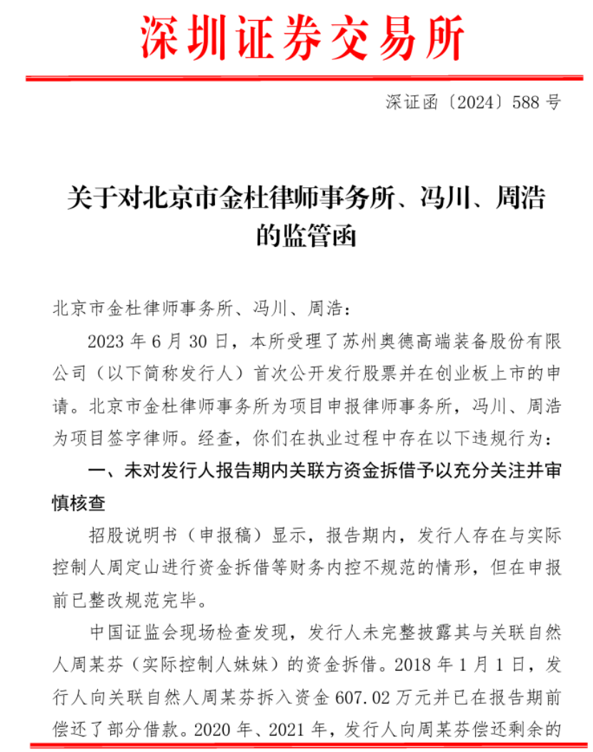 深圳证券交易所发布了《关于苏州奥德高端装备有限公司、周定山、祝新生、俞莉茜的监管函》。