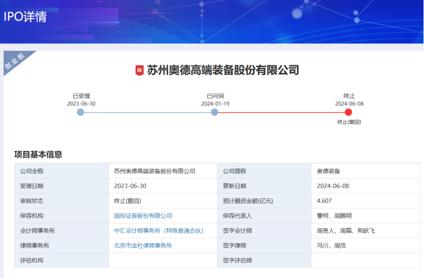 据悉,2023年6月30日,苏州奥德高端装备有限公司(以下简称“奥德装备”)受理了创业板上市申请,今年1月19日上市审核状态调整为“咨询”。今年6月8日,公司取消上市申请,IPO停止。