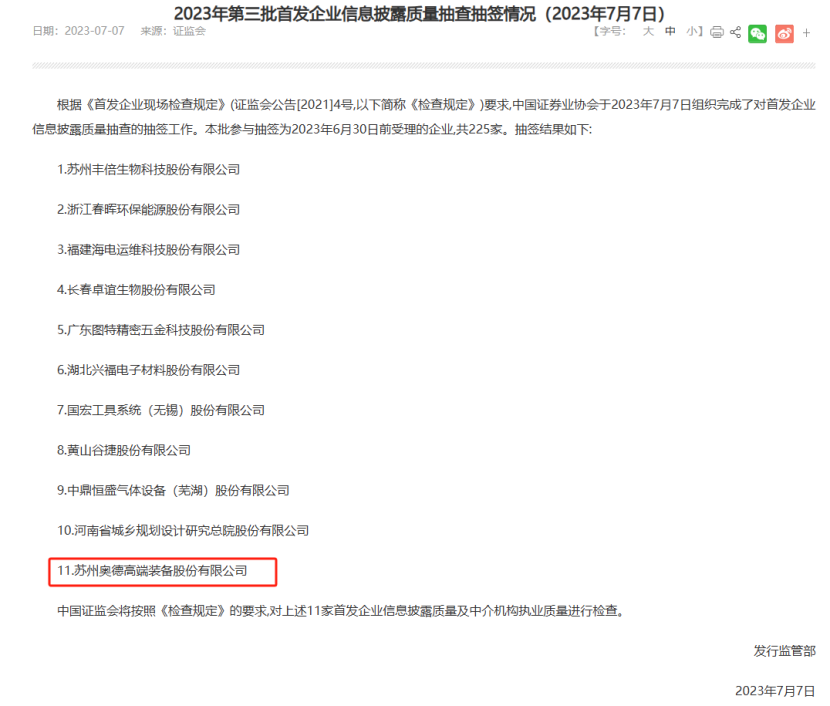 值得一提的是,2023年7月7日,中国证券交易所协会组织抽签抽查首发公司信息披露质量。11家企业被抽中,奥德设备被列入名单。中国证监会对其信息披露质量和中介机构执业质量进行了现场检查。