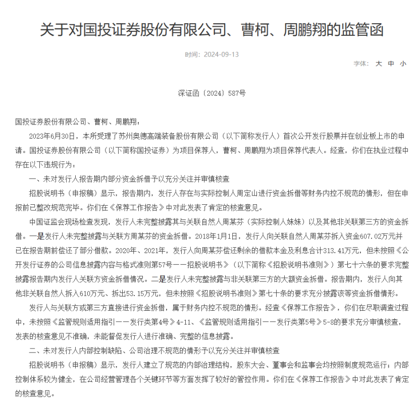 监管函显示,在未完全披露的报告期内,与关联方和第三方的资金被借出;未充分披露内部控制缺陷和公司治理不规范;部分会计处理不合规、相关信息披露不准确等违规行为。最后,发行人奥德设备、保荐机构国家投资证券、律师事务所北京金杜研究所、会计师事务所中汇研究所及相关人员均收到深交所书面警告函。