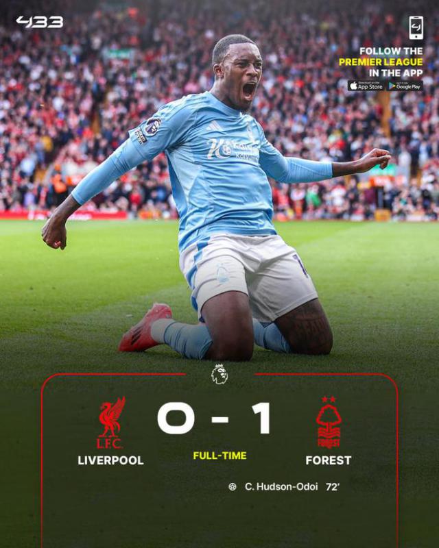 利物浦主场 0-1 爆冷不敌诺丁汉森林,遭遇第一次失利。迪亚斯射中了柱子,若塔门口造险,奥多伊打进了全场唯一的进球。