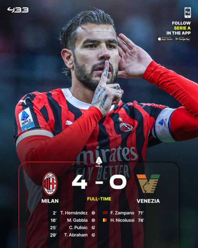 意甲第 4 轮,AC 米兰主场 4-0 赢得威尼斯,赢得第一场胜利。莱奥成功助攻特奥爆炸,福法纳垫射扩大比分,普利西奇点击下一个城市,亚伯拉罕点击第一个进球,卡维利亚被罚下两个黄色和一个红色。