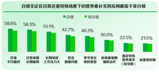 中国疾病预防控制中心营养与健康研究所研究员霍军生表示,白领普遍存在饮食不规律、工作压力大、体力活动不足、睡眠不足等常见问题,导致超重肥胖和微量营养素摄入不足。因此,白领可以在改善饮食的基础上,选择合适的保健食品来维持健康需求。