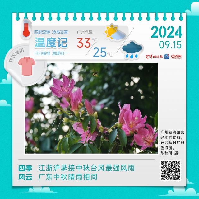 15 日,清远、韶关、珠江三角洲、粤西市县阴天多云,有渗透性中(雷)阵雨、局部暴雨,其他市县阴天分散(雷)阵雨;各地雨季有局部伴随 7~9 一级雷雨大风。最高气温:河源、梅州、珠江三角洲部分市县 34~36 ℃,其他市县 30~34 ℃。