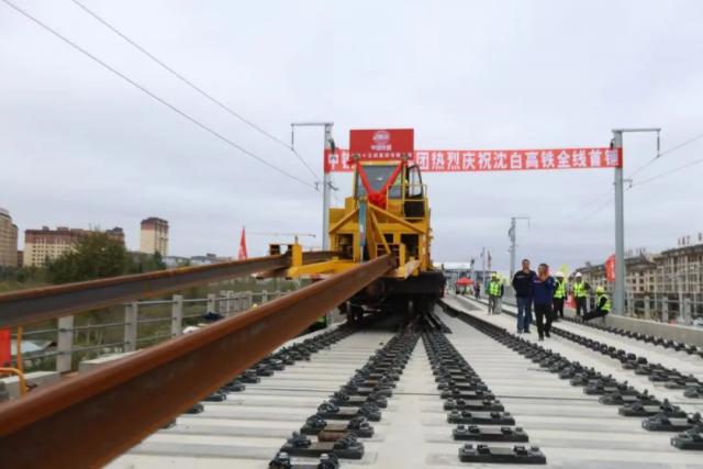 9 月 14 日 10 时 18 随着第一个无轨道铺轨机组的完成,分 500 米线长轨铺装工作,意味着沈白高铁全线进入铺轨阶段。