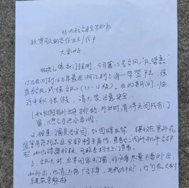 各居民区提前发布台风天注意预防的温馨提示,引导居民将阳台外的花盆等杂物搬到安全的地方,台风期间关闭窗户,减少不必要的外出。物业公司工作人员对小区内的排水井、排水沟、排水管、屋顶排水口进行全覆盖检查,并对容易渗水、渗水、存水等关键部位进行全覆盖检查,努力落实各种预防措施。