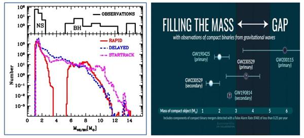 左边的条形图是中子星观察到的。(NS)与黑洞(BH)质量分布,不同颜色的线代表不同星星(超新星爆炸)理论预期的中子星和黑洞质量分布
