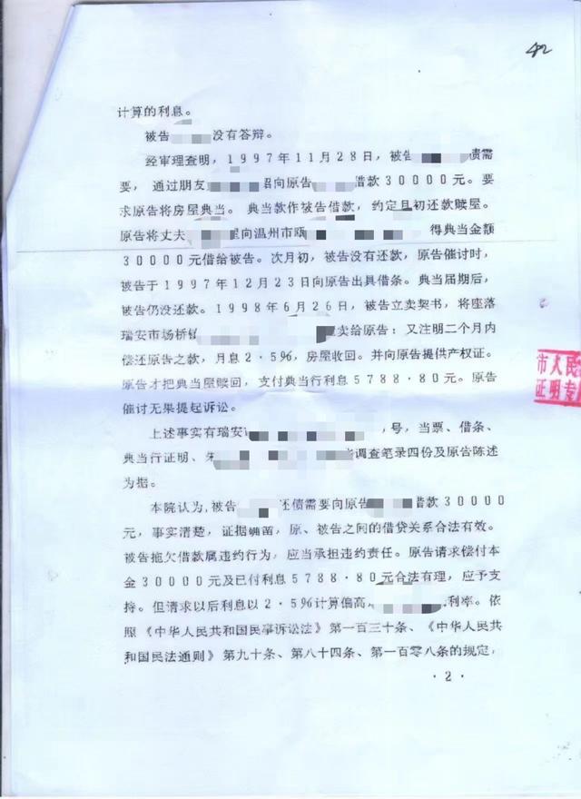 根据朱女士提供的法院判决,经审理发现,被告黄某因还债需要向朱女士的母亲借款。 3 一万元,要求朱女士妈妈将丈夫的一套房子典当,典当款作为被告贷款,约定月初还款赎屋。后原告典当 3 一万元借给被告,第二个月初,被告没有还款,原告追债时,被告于 1997 年 12 月 23 日本向原告提供借据。在典当期之后,被告仍然没有偿还。